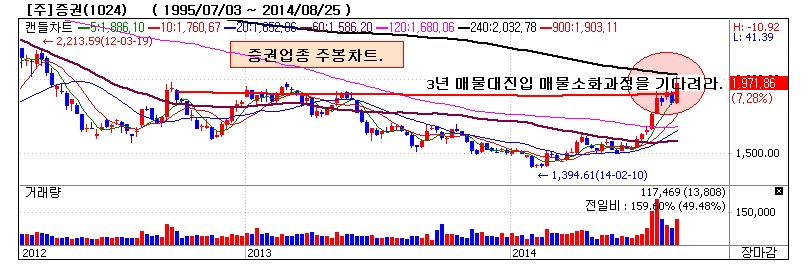 제한된 범주흐름을 보이고 있는 현대차는 상승세로 반전한 모습을 보이고 있으며 삼성전자 역시 123만원대에 진입하여 상승을 모색하는 모습이다. 포스코,kt 같은 주식은 장기 상승세로 반전된 모습을 보이고 있으며 sk하이닉스는 조정세를 더 이어갈 모습이다. 시장상승흐름을 주도하였던 증권주는 3년 매물대에서 진입한 상태로 엄청난 매물대에 봉착하고 있어서 매물소화에 상당한 시간이 걸릴 전망이며 조정은 불가피해 보인다. 즉, 지수를 잡아주는 대형상위사 주가흐름이 상승 또는 횡보를 할 모양세이므로 증권주흐름이 조정에 진입한다고 해도 지수의 흐름은 나쁘지 않을 전망이다. 증권주의 경우 7천원 8천원권에서 공개방송을 통하여 남의 떡이 커보이는 욕심을 버리고 지금 매수해서 기다리면 큰시세를 줄 것이고 언급할 때는 뭐하고 이제 조정권에 들어가는 시점에서 요란한가? 참고로 증권업종 차트를 올린다.