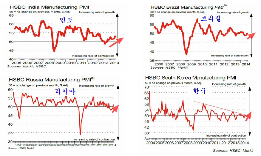 2011년 하반기 세계 제조업이 위축된 이후 가장 어려움을 겪었던 나라는 서비스업에 비해 제조업 비중이 상대적으로 높은 신흥국으로 장기간 경기 둔화가 나타나 주가 조정이 이어졌다. 그러나, 경기 확장기준인 50 아래에 있던 한국, 멕시코, 러시아가 모두 50위로 올라서 경기 확장 국면에 합류한 가운데 인도, 중국, 멕시코, 대만 등은 이미 상당한 확장 국면을 이어갈 예정이다.