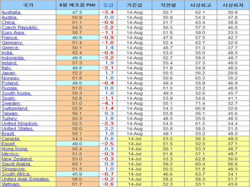 다음은 세계 각국의 제조업 경기를 나타내는 PMI 지수이다. 8월을 기준한 것이며, 아직 PMI지수가 발표되지 않은 국가는 7월 지표를 나타낸다. 이 경기 지표는 50 이상(붉은색 표시)이면 경기 확장국면을 나타내고, 50 미만(하늘색 표시)이면 경기 수축국면을 나타낸다.