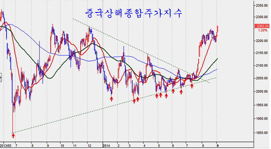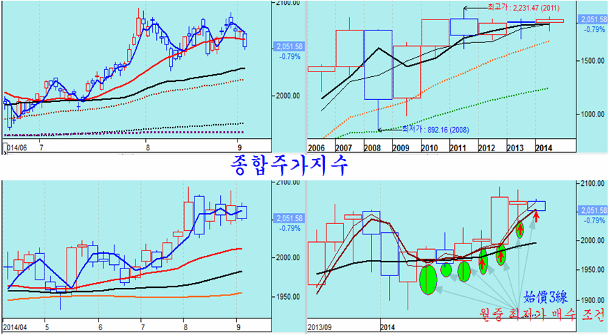 이런 하락의 변동은 상승 추세중 전약후강의 상승 리듬이다. 주가는 보통 시가3선의 평균선까지 이격 조정을 거쳐 상승이 쉬운데 오늘 주가 하락으로 9월중 최저가격 매수 기준인 시가3선 가격까지 조정이 이뤄졌다. 월초부터 월중 최저가격 매수 조건이 형성된 셈이다.