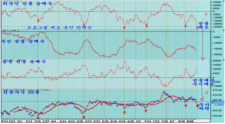 지수를 움직이는 외국인은 그간 매수했던 선물을 한꺼번에 쏟아내며 프로그램 매도를 유인하였고, 이와 함께 증권을 비롯한 기관의 프로그램 매물이 지수를 압박하여 하락 마감하였다.