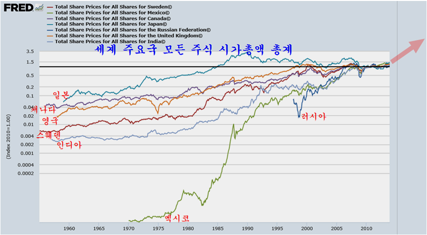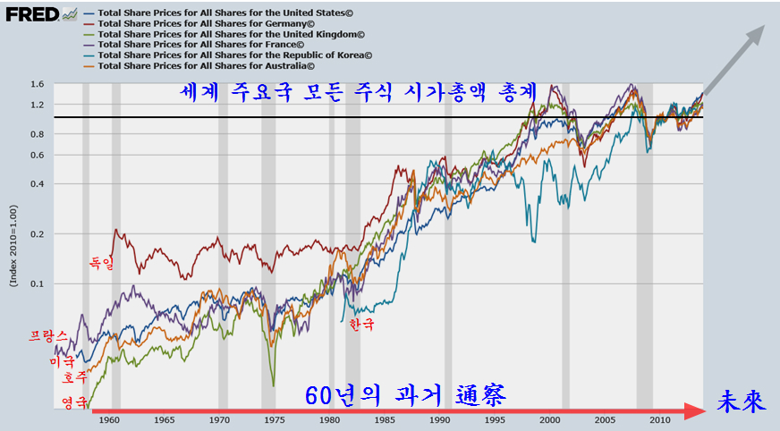 다음은 지난 60여년 간의 각국 주가 움직임이다. 과거로부터 현재까지를 긴 과정을 꿰어서 보면 미래를 볼 수 있는 길이 열린다. 과거의 통찰로부터 가능한 온갖 상상력을 동원하여 미래를 그려보라. 그러면 안개속 같았던 앞으로의 시장의 모습이 다가오게 될 것이다.