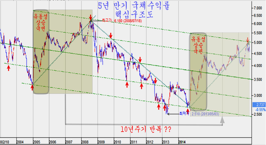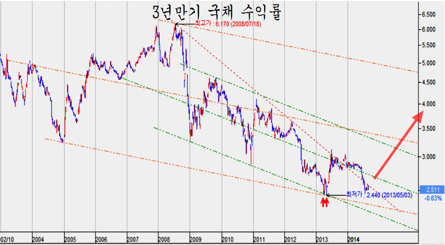 그러나, 국채금리가 대세 채널의 하단에 접한 만큼, 대세의 추세 전환이 임박한 시기이다. 지금으로부터 정확히 10년 전에도 주가 상승에 관계없이 국채 금리가 금락하며 국채가 급등세를 나타냈다. 이처럼 추세 전환점에서 금리가 급락하고 채권이 급등하는 이유는 장기간 상승한 채권을 천정에서 차익실현하기 위한 목적이다.