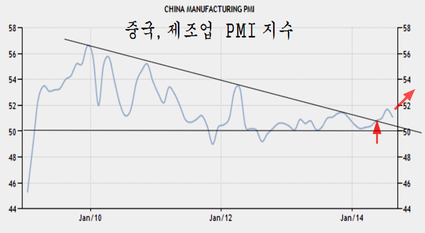 2011년 하반기 이후 감소가 이어지던 제조업 PMI 지수가 대부분 확장기준인 50을 넘어 있다. 세계 제조업 1위 국가인 중국은 7월 51.7까지 급등한 뒤 8월 51.1로 감속이 되었으나 여전히 강한 확장 국면을 이어가고, 아직까지 세계 경제 1위 국가인 미국은 58.0을 기록하여 미국 역사상 최고인 58.3에 근접하고 있다.