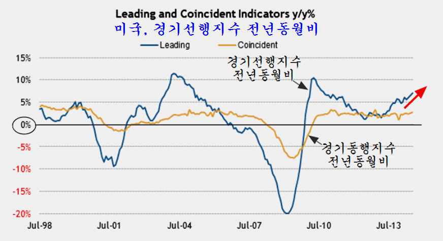 다음은 미국의 경기는 이 보다 더 좋을 수 없는 국면으로 가고 있다. 경기선행지수, 소비자 신뢰지수, 제조업 ISM 지수는 대단히 강력한 경기 확장국면을 나타낸다.