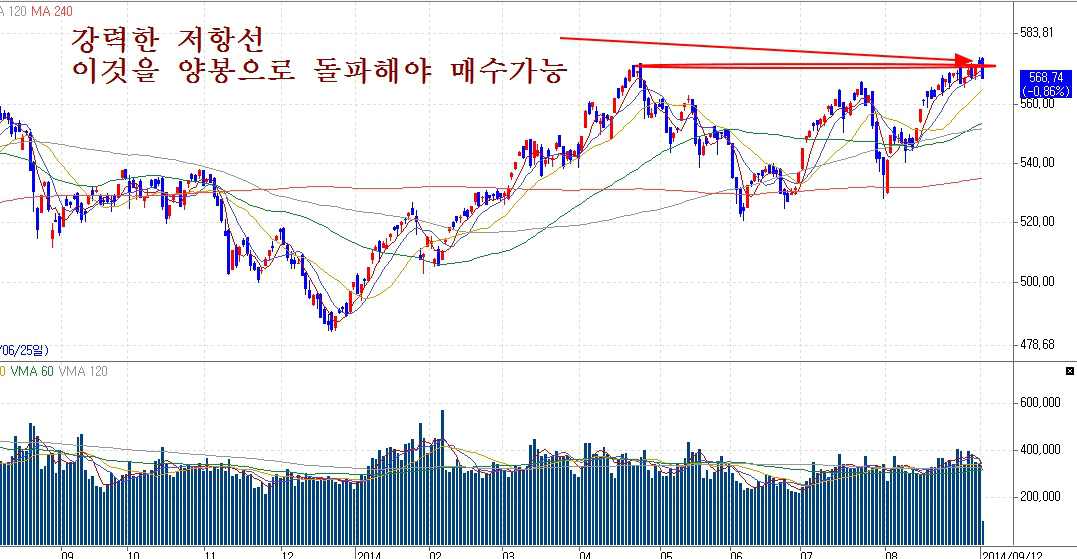 코스닥일봉은 중요저항선을 이기지 못하는 모습입니다 .