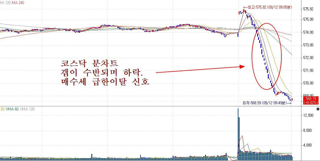 코스닥 분차트를 보면 급락파동이 큼을 볼 수 있습니다.