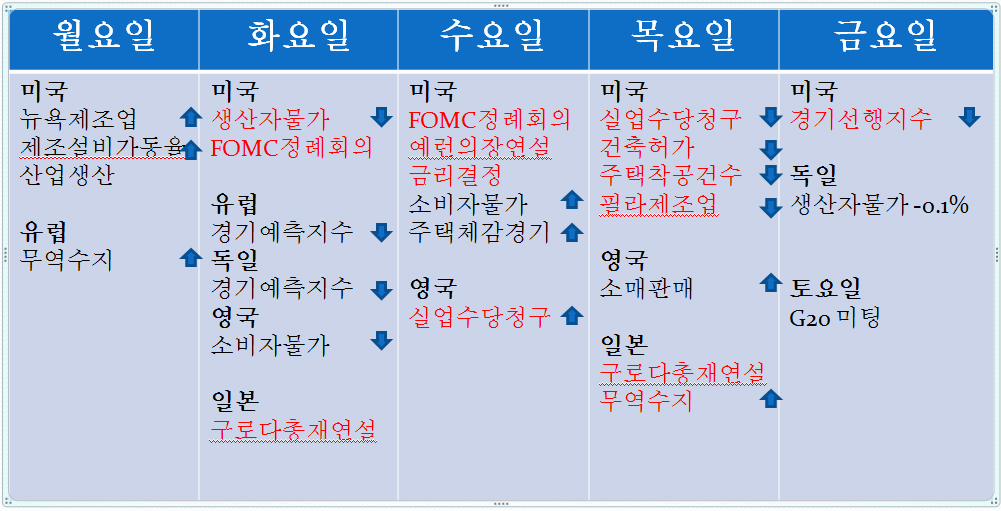 이번 주에는 16일~17일에 열리는 미국 FOMC 통화정책회의를 비롯해서 옐런의장이 기자 회견에서 기준금리 인상 시기에 대해 어떤 의견을 내놓을지에 시장의 이목이 집중되고 있다.