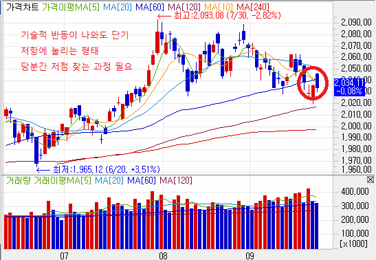 기술적 흐름으로 보면 저점구간에서는 120일 이평선을 지지 받으며 반등을 시도하는 모습을 나타내고 있지만 20일선에서 저항을 받는 모습을 보이며 추세적으로 아직 안정적인 흐름을 보여주지 못하고 있다.