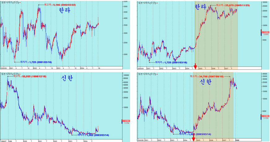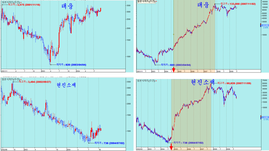 이렇게 지루하게 움직이던 주가는 2003년 또는 2004년 저점으로부터 3년 만에 한라(건설) 1,500%, 신한 2,500%, 태웅 16,300%, 현진소재 8,230%가 오른다. 20%, 50%의 자잘한 변동이 아니라 큰 흐름의 대세 상승이 나타나고, 그 상승하는 속도는 이전의 움직임으로 예상하기 어려운 변화가 나타난다.