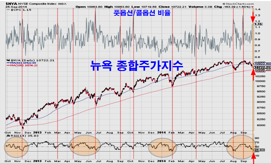 뉴욕 종합주가지수도 풋옵션 매수 과열과 함께 주가가 하락했으나, RSI 상대 강도로 보면 연중 두차례 정도 나타나는 조정권의 저점이 되어 있어 상승이 기대되는 모습이다.