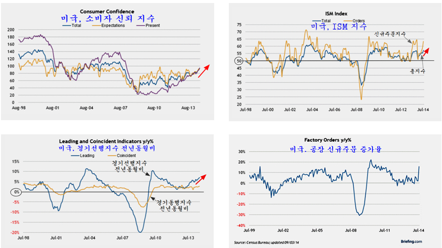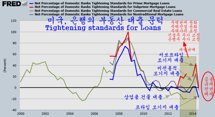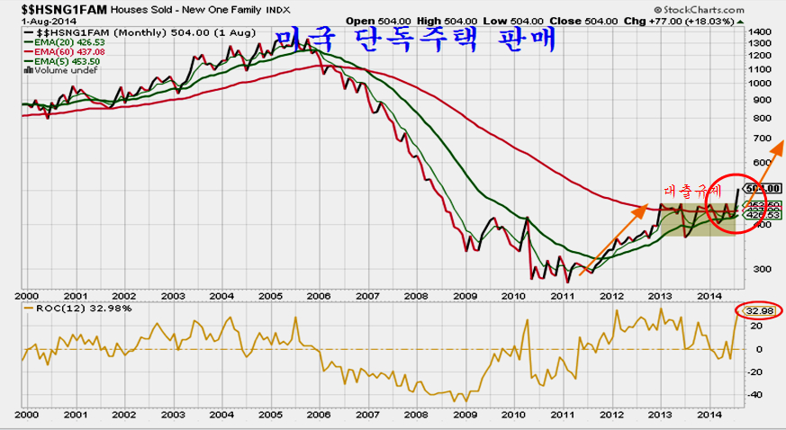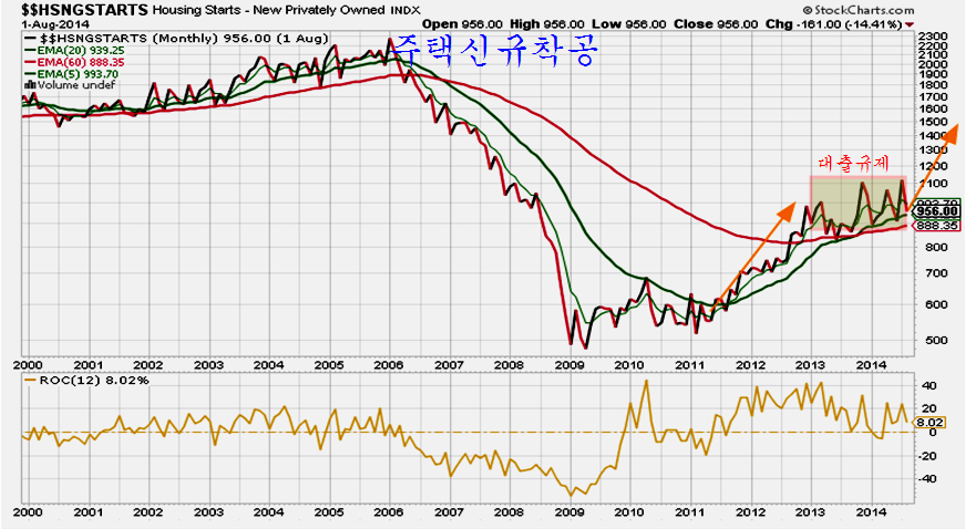 2014년 상반기 드디어 주택가격이 전월대비 하락으로 전환됨에 따라 미국의 은행들은 대츌규제를 완전히 없애고 서브프라임 대출마저 대출 문턱을 아예 없앤 모습이다. 이 결과 발표된 8월의 신축주택 판매는 그간의 박스권을 힘차게 돌파하며 증가율에서는 1990년대 주택 경기 회복 시작인 1992년 이후 가장 가파른 증가율을 보이고 있다.