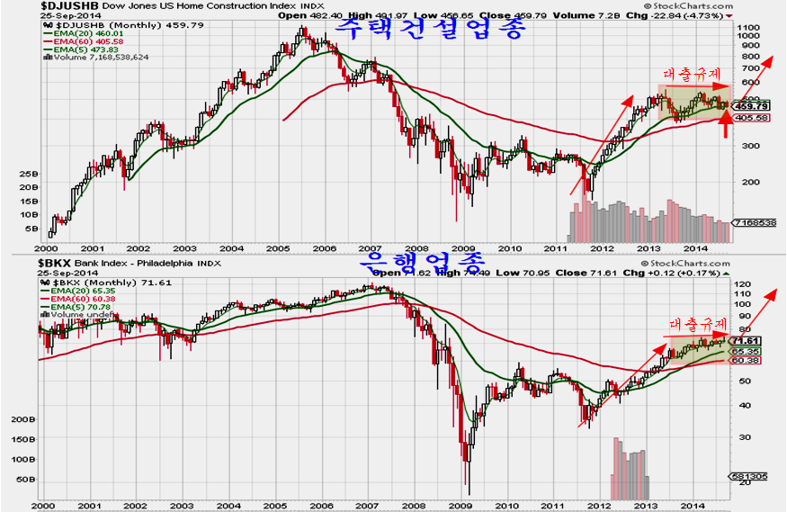 부동산과 건설은 프라임 모기지 대출보다 서브프라임 모기지 대출, 즉, 한계 수요자의 대출 용이도에 따라 경기가 움직인다. 2013년부터 서브프라임 대출 문턱이 높아지면서 주택판매, 주택건설, 주택가격 상승, 건설업 주가와 은행업 주가가 함께 조정을 거치고 있다. 대출 규제와 함께 선도 업종인 건설과 은행주가 20개월여의 조정을 거치고 있다.