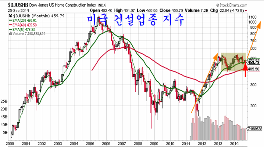 사실 미국의 경기는 2011년 10월부터 회복이 시작되었고 이 경기 회복은 부동산 가격의 상승과 건설 착공의 꾸준한 증가를 반영하며 모든 업종중에서 건설업과 건설자재가 가장 빠르게 상승하며 지수 상승을 선도했다. 건설업종은 2011년 10월 저점으로부터 2013년 5월고점까지 저점대비 260%가 오름으로써 어떤 업종보다 강한 상승을 했다.