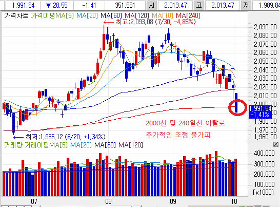 2000선은 240일 이평선이 자리잡고 있던 구간이었는데 장중 이 부근에서 전혀 매수세의 흐름을 보이지 못하고 떨어졌다는 것은 투자심리의 급격한 냉각상태임을 잘 표현하고 있다는 것이다.