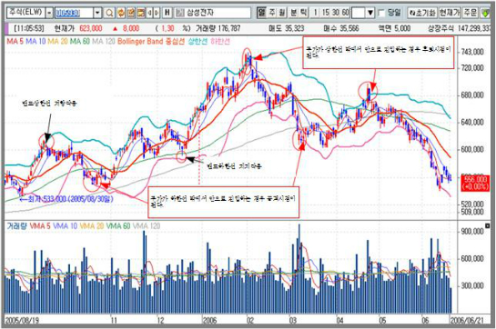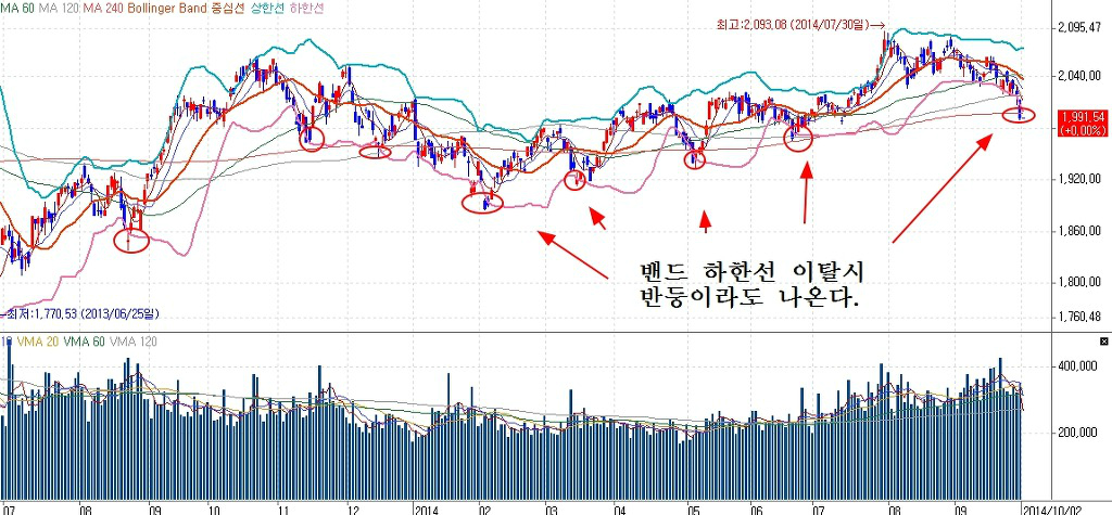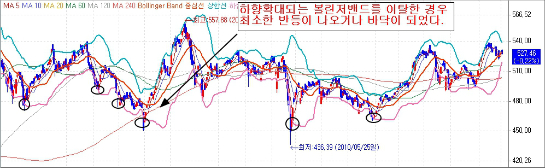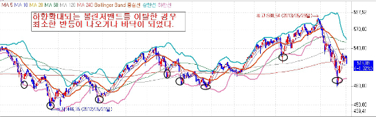 안녕하세요! 페라리 입니다. @이제서야 과매도 신호가 잡힌다. 주식을 하다보면 막연하게 저가매수에 가담하시는 분들이 많습니다. 그냥 고점대비 얼마 하락했으니 이제는 반등이 나오겠지 하고 매수하면 또 하락하고 그리고 손실이 커져가게 됩니다. 그리고 본격하락이 나오게 되면 그것을 이기지 못하고 공포에 질려 주식을 매도하게 되면 그 후 급등하게 됩니다. 이런현상이 발생하는 것은 과매도를 판단하지 못하고 있기 때문입니다 . 줄줄줄 흘러내리듯 하락하는 시장은 반드시 과매도가 나와야 추세전환이 나타나게 됩니다. 그 과매도를 판단하는 지표로 볼린저밴드를 강조드립니다. *금일 거래소시장은 하락하고 있지만... 오후장 낙폭을 축소시킬 가능성이 높습니다. 그리고 다음주는 반등시도가 나타날 수 있습니다. 전일 미국증시는 제조업지수가 예상치를 하회하게 발표되면서 주가가 급락으로 마감했습니다. 얼핏보면 겁나고 오늘도 폭락이 나오지 않을까? 염려 되시는 분들이 많을듯 합니다. 전일 한국증시가 급락했는데 왜 ? 급락했을까요? 이런 부분을 선반영 한것도 있습니다ㅣ 물론 글로벌증시가 흔들리고 있는것은 분명하나 금일은 크게 두려워할 필요는 없습니다. 거래소는 전일 하락으로 인해 볼린저밴드를 하향 돌파 했는데 이렇게 되면 당장 추가급락은 나오지 않습니다. 오히려 반등시도가 일시적으로 나올 수도 있습니다. 물론.. 진바닥을 논할 단계는 아니지만 이런 하락이 대형주 저가매력을 더욱 크게 만들 것입니다. *코덱스레버리지(122630)를 잡는것도 좋은 방법입니다. *거래소 일봉차트 볼린저밴드 하한선 이탈 후 주가흐름 금일 거래소는 볼린저밴드를 갭으로 이탈했는데 이것은 단기과매도 신호로 저가매수 기회가 됩니다. 진바닥인지 아닌지 모르나 최소한 추가급락은 없고, 반등이라도 나오게 됩니다. 어느경우는 이시점이 바닥이 되는 경우도 있습니다. @페라리와 함께 초보투자 장군만들기 프로젝트 지난 시간에서는 후퇴신호를 알리는 패턴에 대해 알아보았습니다. 이번에는 보조지표 및 동맹지표를 활요하는 법에 대해서 알아 보겠습니다. 보조지표의 종류는 수없이 많지만 실전에서는 사실 별 도움이 되지 못한다. 보조지표는 과매수, 과매도 징후를 확인하는데만 사용화면 된다. 보조지표에서는 과매도(투매)를 판단할 수 있는 볼린저밴드만 알아 보도록 하겠습니다. @볼린저밴드(Bollinger band) 볼린저밴드는 일정기간 동안에 결정되는 가격 수준과 변동성을 측정하는 지표로서 중심선과 밴드상한선, 밴드하한선으로 구성되어 있다. 볼린저밴드는 변동성 측정을 위해 표준편차를 사용하며, 급격한 가격변동으로 인하여 변동성이 증가하면 밴드폭이 확대되고, 시장가격이 완만한 변동성을 나타내면 밴드폭이 축소되는 형태로 나타나게 된다. 볼린저밴드는 횡보 후 주가의 방향을 잡을 때와 과매수, 과매도권을 찾는 데 유용한 지표이다. 볼린저밴드의 중심선으로 사용되는 이동평균기간은 보통 20일을 사용한다. 1) 볼린저밴드를 이용한 매매전략 ① 지지, 저항을 이용한 전략 보통 밴드상한선은 저항작용을 하고, 밴드하한선은 지지작용을 하게 되는데 이것을 이용해 매매전략을 세울 수 있다. 중심선은 20일선과 같으므로 주가가 중심선 밑에 있을 때는 저항작용을, 중심선 위에 있을 때는 지지작용을 한다는 간단한 원리이다. 하지만 밴드는 주가가 올라가면 위로 같이 움직이며, 하락하면 아래로 같이 움직이는 만큼 지지선과 저항선을 찾기가 쉽지는 않다. 따라서 아래의 전략을 사용하게 된다. ② 과매수, 과매도의 지표로 활용 가격변동의 폭이 클 경우 주가는 계속 같은 추세로 움직임을 의미한다. 변동폭이 적을 경우 주가는 현재까지 진행되어 온 추세가 약화되어 횡보함을 의미한다. ✜공격준비 하한선 근처에서 주가가 움직일 때(과매도 구간). ✜후퇴준비 상한선 근처에서 주가가 움직일 때(과매수 구간). 주가가 밴드를 이탈한 이후 넓어진 가격밴드에서 다시 주가가 가격변동밴드로 재진입하는 경우 중요한 매매타이밍으로 잡는 것이다. 즉, 주가가 상한선 밖에서 안으로 진입할 경우 후퇴시점이 되며, 하한선 밖에서 안으로 진입할 경우 공격시점이 된다. 차트 Ⅲ-12 볼린저밴드를 이용한 과매수, 과매도 찾기 ③ 볼린저밴드를 활용한 초단기전 볼린저밴드는 주가의 변동성을 나타내는 지표임을 알려드렸다. 주가가 하락하면 하락할수록 밴드의 폭도 확대된다. 그런데 확대되고 있는 밴드의 하한선을 완벽하게 이탈했다면 무엇을 뜻할까? 바로 기존의 하락보다 더 큰 하락이 발생했음을 뜻한다. 즉 투매가 발생한 것이며 비이성적인 하락이 발생했다는 뜻이다. 이때 주가는 다시 밴드 안으로 회귀하려는 특성이 생기는데 이것을 이용해 단기매수로 수익을 올릴 수가 있다. 사실 이 내용은 이해가 어려운 부분으로 철저한 원리습득이 필요하다. 필자의 강의를 듣지 않고는 이 기법을 이해하기 어려우니 이 부분만큼은 필자의 강의를 청취하신 분만 활용하길 바란다. 【조건 1】밴드 하한선을 개별주는 10%, 중대형 우량주는 5% 이상 하향이탈할 것. 밴드 하한선을 10% 이상 하