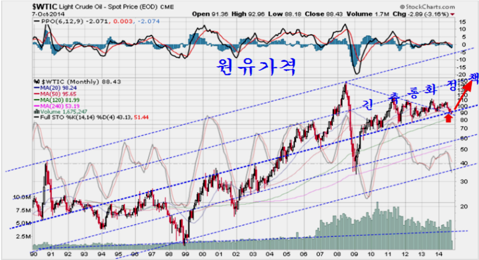 원유 가격은 경제지표에는 물가지수에 영향을 미치고, 업종별로는 정유와 화학, 에너지 업종을 직접적으로 영향을 미치고, 태양광과 풍력 등 대체 에너지에도 간접 영향을 미친다. 유가가 그간 원유시장의 투기와 함께 장기간 조정을 거쳤으나 24년 변동의 중심선의 중요한 지지권에 있어 향후 상승을 할 곳이며, 이와 함께 정유, 화학, 에너지, 태양광, 풍력의 상승을 이끌게 된다.