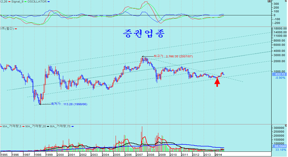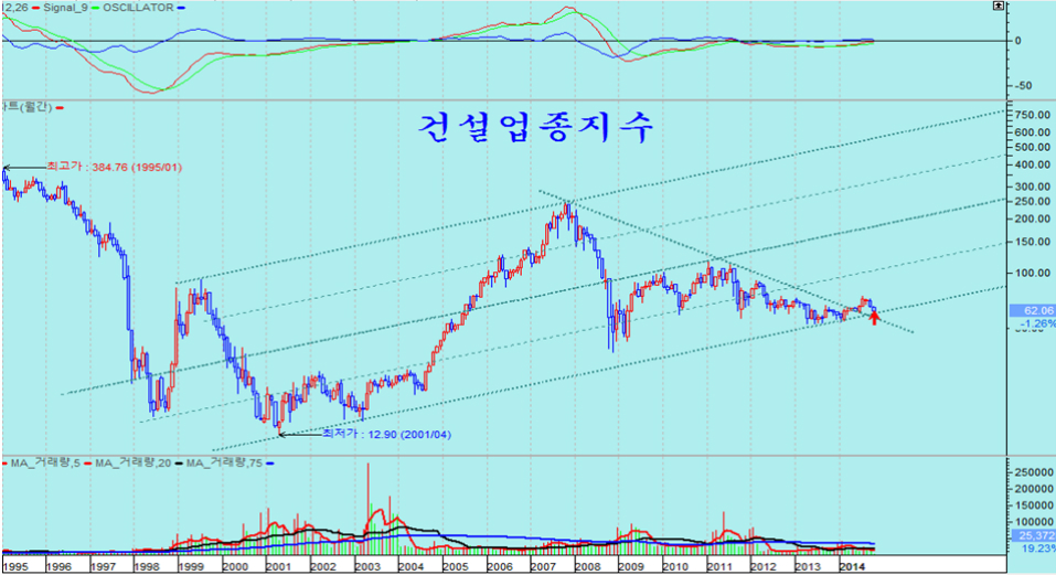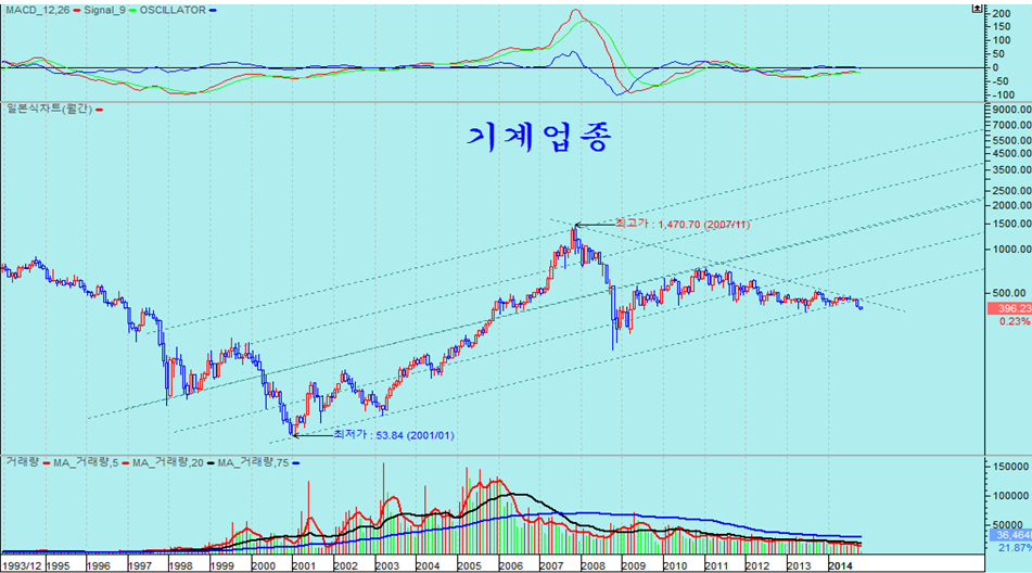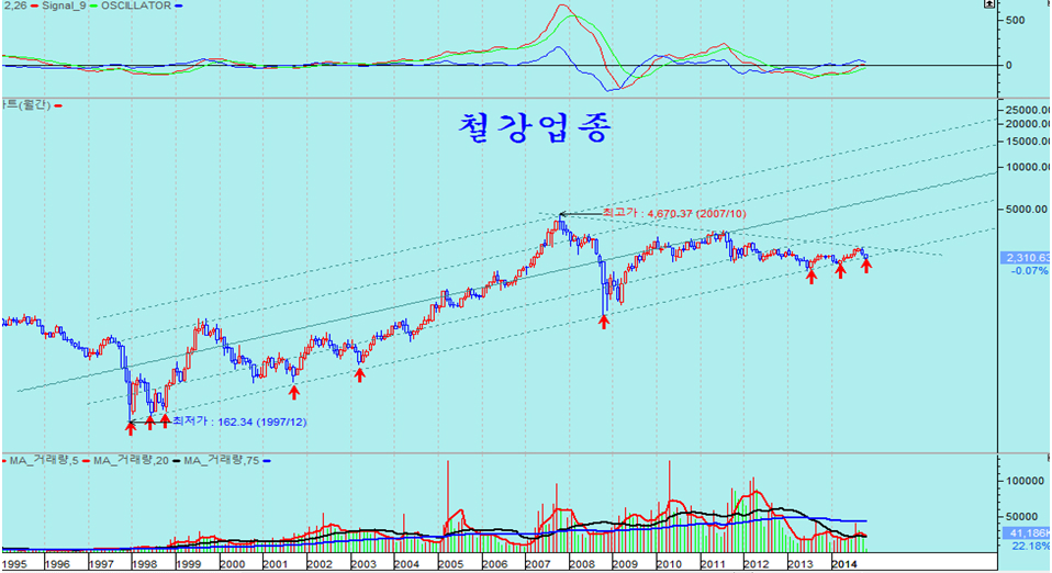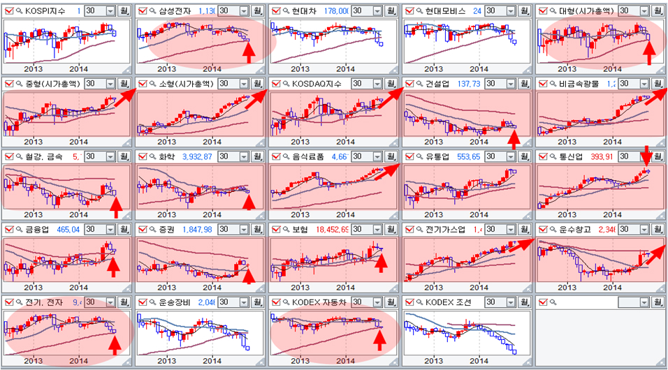 3주 가까이 급락이 이어지고 특히 기관들이 작심한 듯 공격적으로 매물을 쏟아내 하락시키면서 심리적으로 위축되기 쉽지만, 변동이 무시되고 추세가 드러나 보이는 월봉 추세로 보면 하락을 주도했던 삼성전자, 자동차를 포함한 대형주 지수는 매수권에 진입해 있고, 중형, 소형,코스닥과 비금속광물, 음식료, 은행, 증권, 보험, 전기가스, 운수업종은 상승 중 조정을 마무리하며 상승을 준비하고, 건설, 철강, 화학, 기계 업종은 상승 추세중 눌림목 저점을 만들며 상승을 준비한 모습이다.