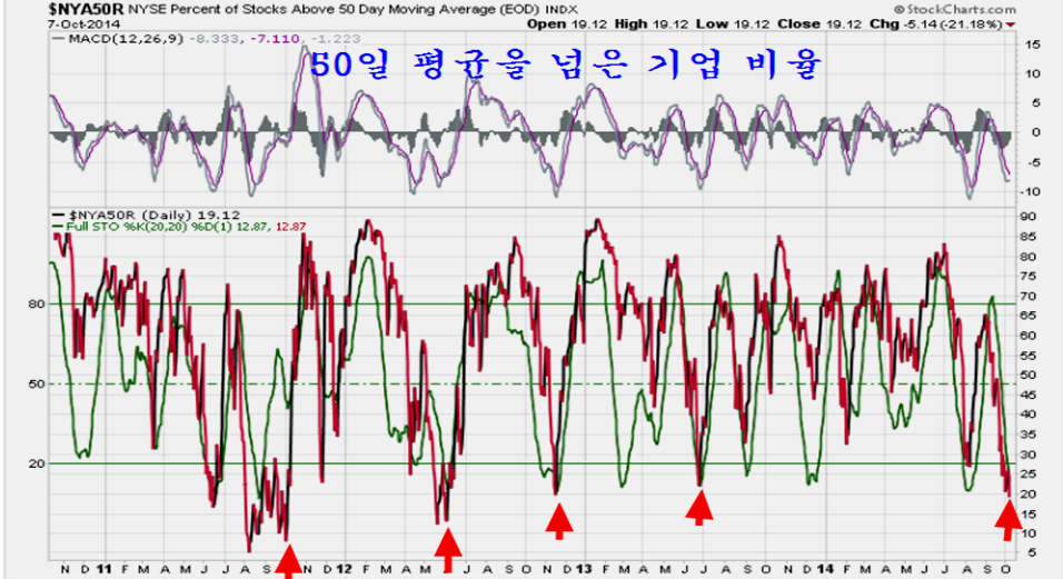 시가총액에 휘둘리는 지수와 달리 시장 자체의 등락 종목수를 반영하는 50일 평균을 넘어선 종목의 비율 역시, 2011년 9월말, 2012년 5월말과 11월말, 2013년 6월말 수준의 저점이 형성되어 있으며, 이것은 앞서 종합주가지수에서 본 지표의 흐름과 같다.