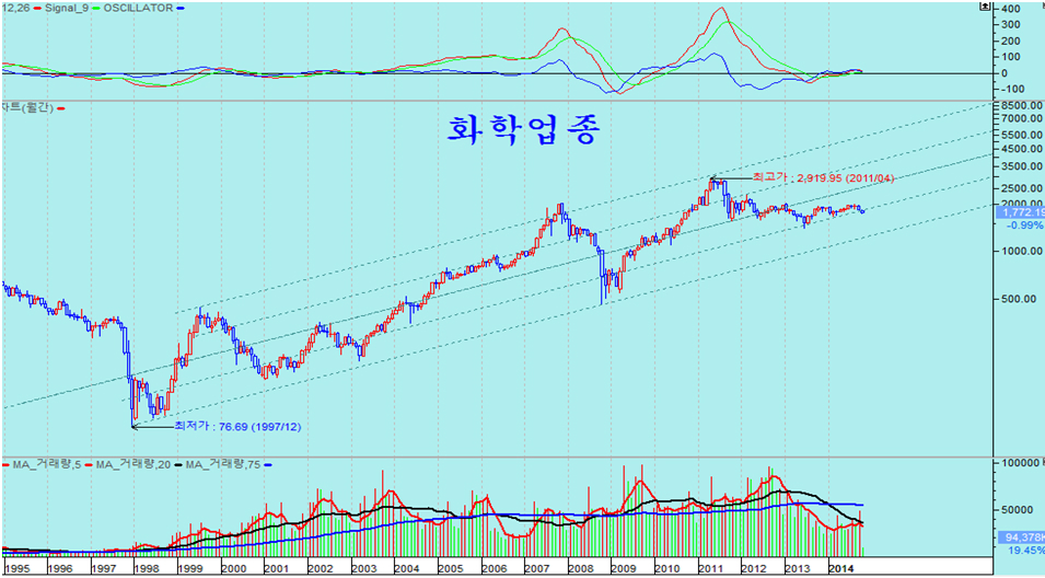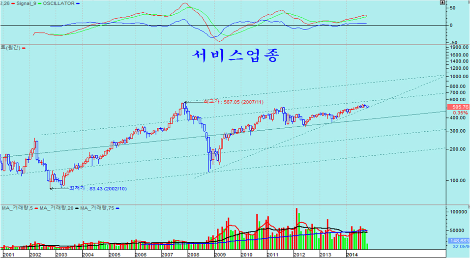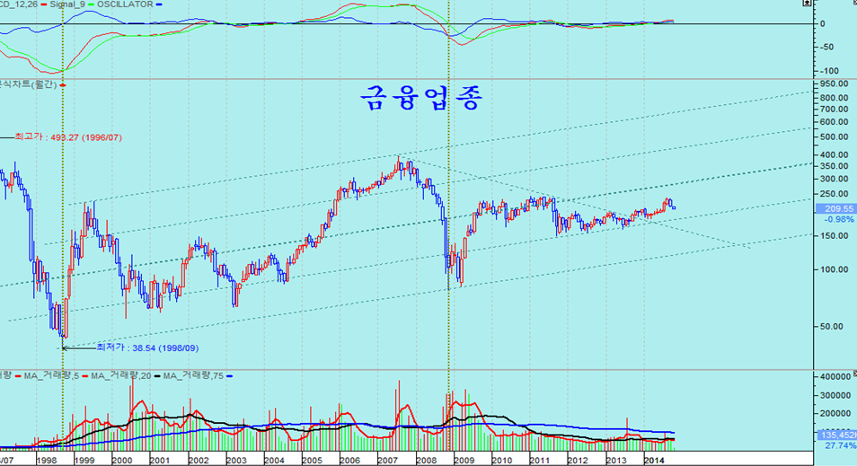 특히 주가는 시장의 거래의 결과로 만들어지는 것이 아니라, 외국인이 철저히 계획하여 그려 나가게 된다. 따라서 외국인이 달러를 기준하여 주가 차트를 그리는 이상 주가는 한국인이 보는 그대로의 차트보다 가격을 달러로 환산한 달러 차트로 보는 것이 더 잘 맞는다. 다음은 각 업종의 달러를 기준한 주가의 추세와 변동 구조이다.