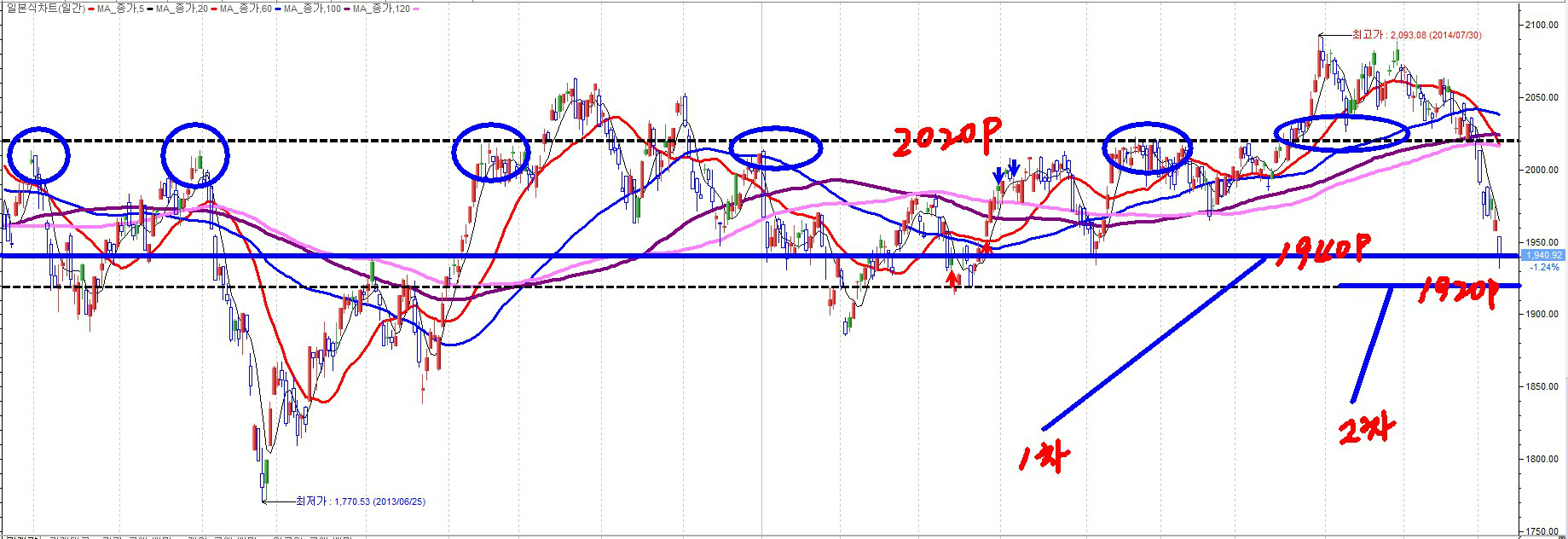 지금 국내 증시는 외국인의 매도로 60선이 붕괴된 이후로 바닥을 찾지 못하고 추락하고 있다. 사실 많은 매물들이 모여있는 2020p(100일선 지지자리)에서 비중을 축소하지 못했다면 현 1차(1940p)와 2차(1920p)에서는 비중 축소의 자리가 아닌 보유관점으로 기다리는 전략이 나아 보인다. 새로이 시작되는 한 주에는 시장에서 15일(수) 금통위의 결정을 확인하고 가자는 분위기가 연출될 가능성이 있으며 유럽 드라기총재의 연설을 비롯하여 연준의장들의 연설과 주요 일정들이 있는 만큼 돌다리도 두들겨 보고 건너는 마음으로 침착한 대응이 필요한 시점이라고 생각한다.