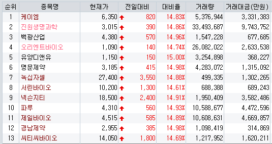 아래 표는 오늘 상한가로 마감한 종목들인데 두종목 빼고는 바이오,제약 재료주들이다.
