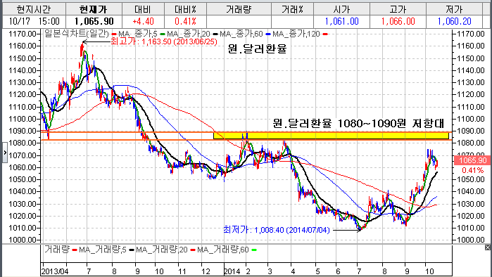 향후 원달러 환율은 1080원~1090원선이 저항대로 작용할 전망이며 조만간 하락세로 돌아설 가능성이 높다. 최근 엔달러 환율이 110원대를 돌파하였다가 106엔대로 하향 안정세로 전환하고 있어 원달러 환율의 하행 안정세 전환에 도움이 될것이다.