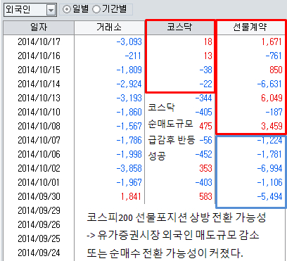 유가증권시장에서 외국인이 현.선물에 대하여 순매수도 돌아설 가능성이 커졌다. 주초를 기대해보자.