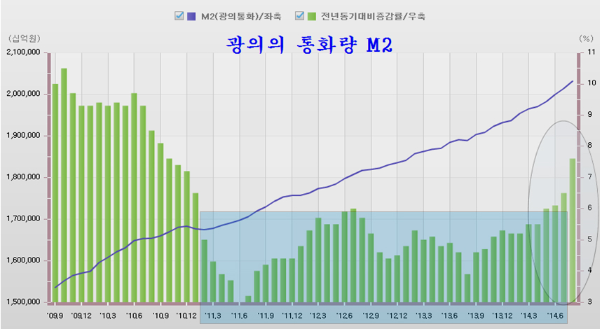M2 통화증가율이 6% 아래로 내려선 2011년 이후 극심한 돈 가뭄으로 기업의 자금난, 부동산과 주식시장의 거래 빈곤, 내수 경기 침체, 세수 감소에 이르기까지 돈 부족에 의한 어려움을 겪었고, 주가 역시 낮은 통화 증가율 만큼 박스권을 벗어나지 못했다.