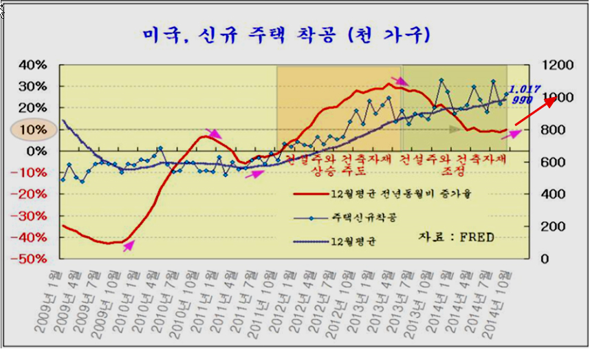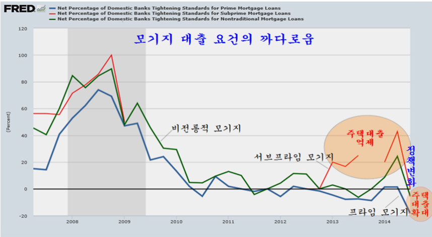 2013년 2분기 이후 주택거래 감소와 신규주택 착공의 둔화가, 은행권의 서브프라임 모기지 대출 문턱을 높여 금융규제의 영향으로 나타났으나, 2014년 3분기 현재 이런 규제를 없애고 주택대출 확대 국면으로 전환이 되어 있어 앞으로 주택거래와 주택건설은 보다 확대될 것으로 보인다.