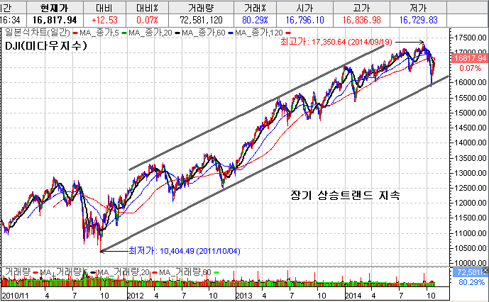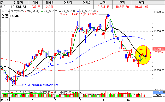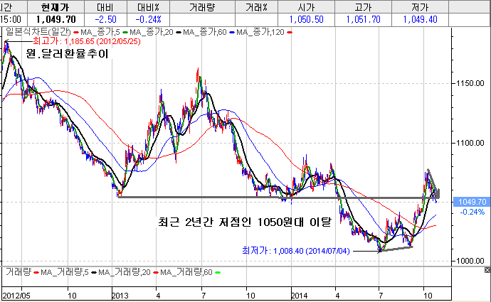 외국의 매매구도에 영향을 줄수 있는 글로벌증시의 중심인 다우지수가 상승트랜드를 지속하고 있고 한국증시와 궤적이 유사한 홍콩H지수가 반등에 성공하였고 원,달러환율이 하향안정세로 접어들면서 외국인의 국내 투자환경이 개선되어 가고 있다. (아래차트 참조)