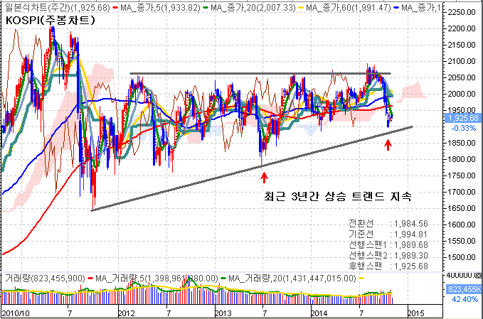 코스피지수와 코스닥지수는 기술적분석상 기 상승 트랜드가 유지중이며 삼각 수렴중이다. 양시장 모두 지수가 삼각수렴이후 상방으로 전환및 추가 상승할 가능성이 크다고 볼 수있다. 이미 코스닥지수는 상방으로 전환한 모습이고 코스피지수는 1900선을 저점으로 한 반등 시도는 계속될 것으로 보인다.
