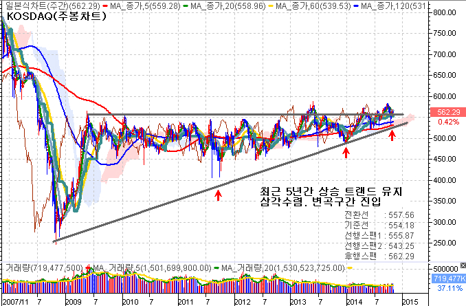선 조짐을 보이고 있으며 주식형펀드로의 자금이 꾸준히 유입되면서 기관투자가들의 시장 매수여력이 강화되고 있다. 코스피지수. 코스닥지수의 장기 추세는 여전히 상방이어서 삼각수렴이후 상승으로 가닥을 잡을 가능성이 크다.