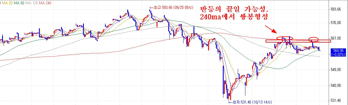 코스닥 60분차트를 보면.. 강한 저항에서 쌍봉을 형성하려 하고 있음을 볼 수 있다.