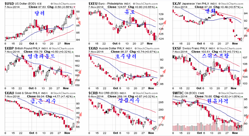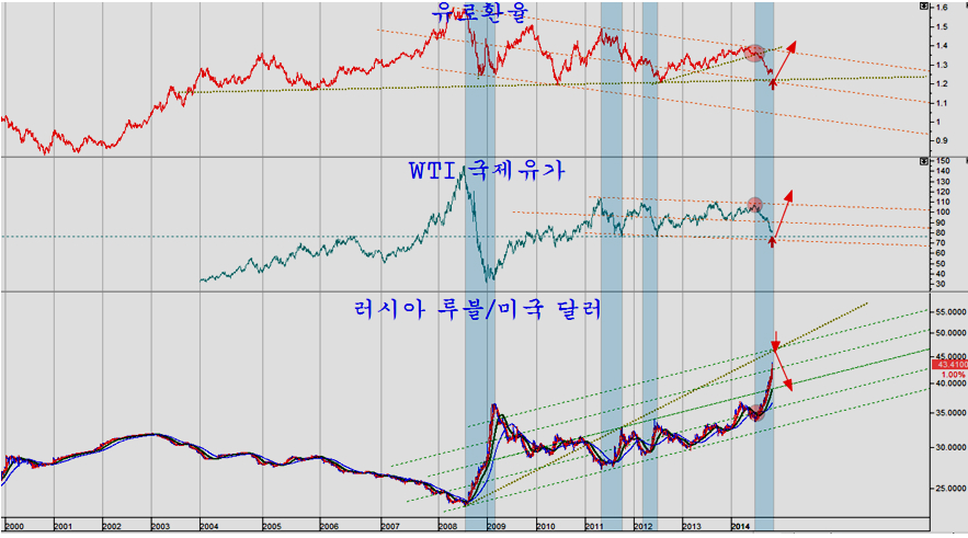 그러나, 루블화가 하락 전환점에 진입하며 유로화가 상승을 시작하고, 금가격이 상승하면 이는 곧 달러가치의 하락이 시작됨을 의미한다.