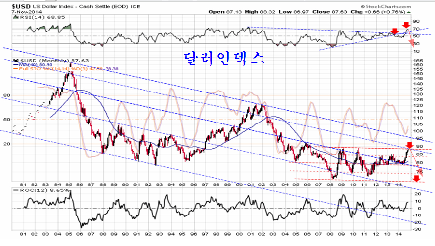 달러 가치를 나타내는 달러인덱스의 대세 추세 구도를 보면 달러화는 중요한 전환점에 진입하여 있으며 그간의