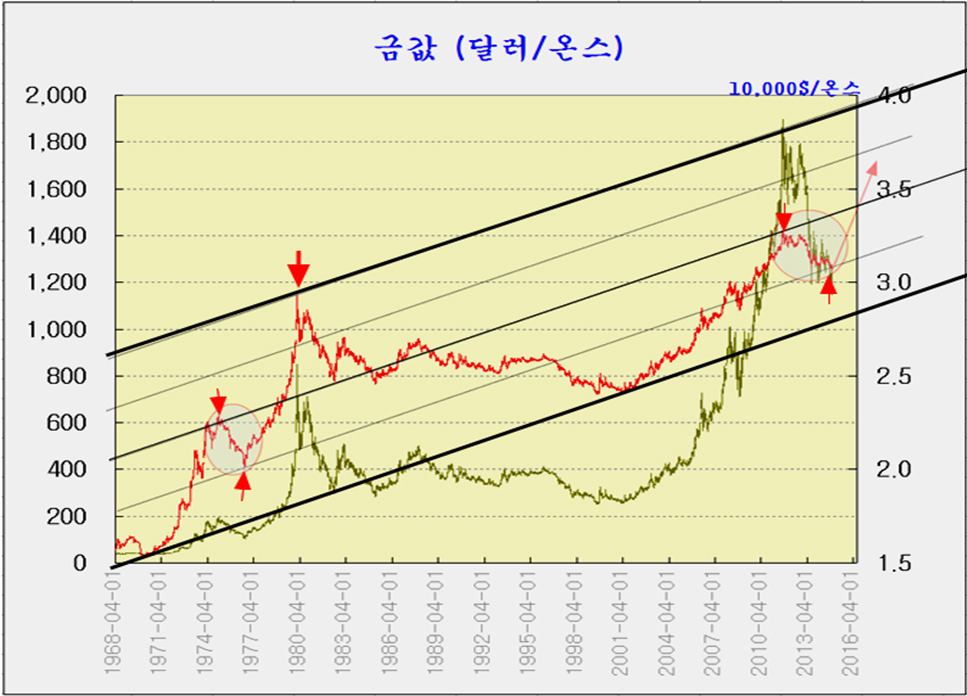 그후 2001년부터 금가격의 상승은 이 채널폭의 절반을 목표로 상승한 후 조정을 거쳐 정확히 1/4에 해당하는 위치까지 조정을 거치고 있다. 1970년대 금가격이 중간까지 상승했다 1/4의 위치로 조정을 거친 후 상승했던 것과 같다. 따라서 이 구도의 흐름을 본다면 장차 금가격은 2011년의 전고점을 넘어 대세 상승으로 전환하는 의미가 있다.