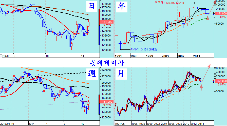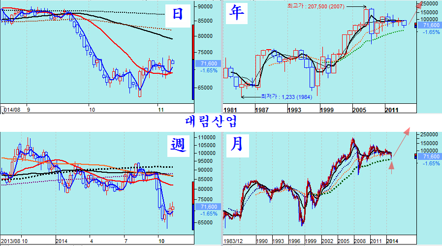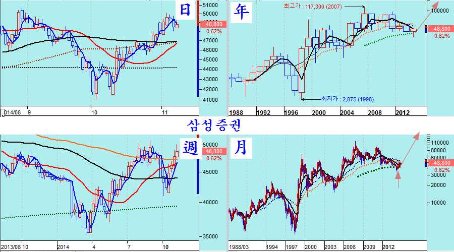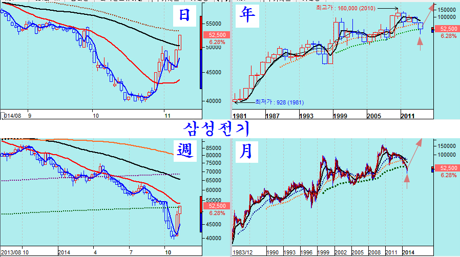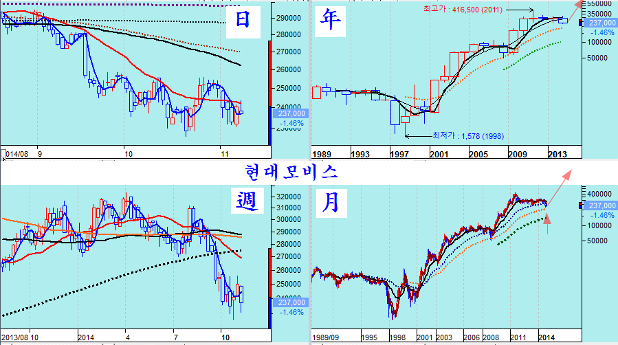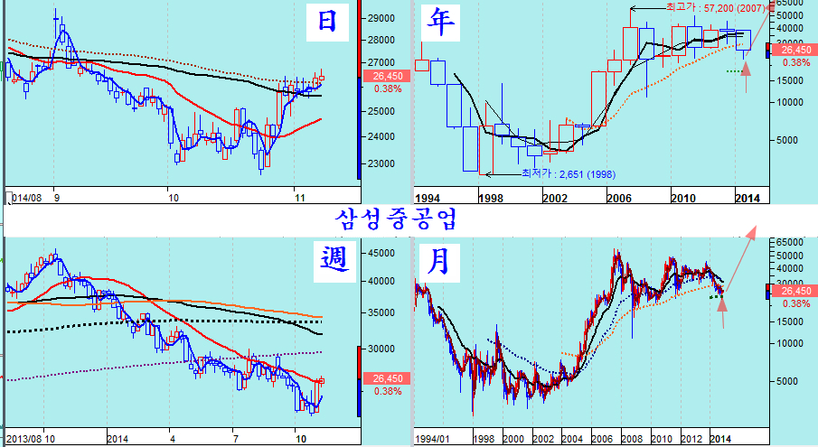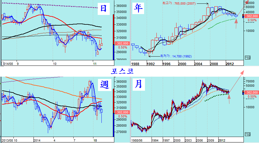 다음은 그간 장기 하락을 했던 경기 민감주중 핵심 우량주들이다. 아무리 불황이 되더라도 마지막까지 살아남을 우리나라 우량주임에도 그간 부실기업처럼 하락해 왔고 7월 이후 급락으로 투자자들의 투자 심리가 싸늘히 식어 있으나, 주가를 월봉와 연봉으로 긴 역사속에서 보면 10년에 한두번 오는 매우 매력적인 투자의 기회이다.