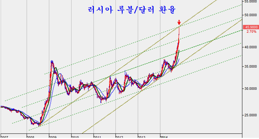 따라서 현재 하락 조정 중인 주식시장이나, 급등하는 달러, 하락하는 상품 시장은 루블화의 급등이 진정되어 반전되는 시점에서 전환된다는 것을 알 수 있다.