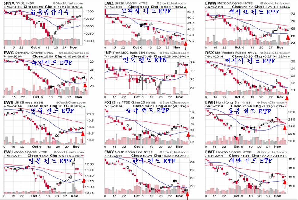 지난 밤 뉴욕시장의 각국 펀드 ETF는 대체로 이번주 20일 평균 위에서 눌림목 조정을 마무리하고 다시 상승을 준비하는 모습으로 보인다. 특히, 환율이 반영된 각국 펀드 ETF는 달러가 약세로 전환되고 각국의 통화가 강세로 움직인다는 점에서 주가상승+환율 하락을 반영하며 비교적 탄력적으로 움직일 가능성이 높다. 다음주 이후 세계 증시의 활발한 모습이 기대된다.