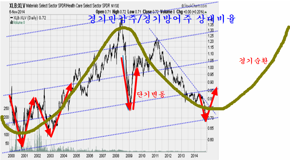 이 비율은 15년의 채널 구도로 보아 채널의 맨 하단에 진입함으로써 그간의 경기민감주 하락의 국면이 끝났음을 나타낸다. 이 흐름은 10년 주기인 쥬글라 사이클을 따라 그림에 나타낸 주기적인 변화를 하게 된다. 따라서 2007년부터 2014년까지는 경기민감주가 상대적으로 하락하는 국면이 이어졌다면, 2014년 ~ 2018년은 경기민감주가 앞서서 움직이는 국면이 이어짐을 의미한다.