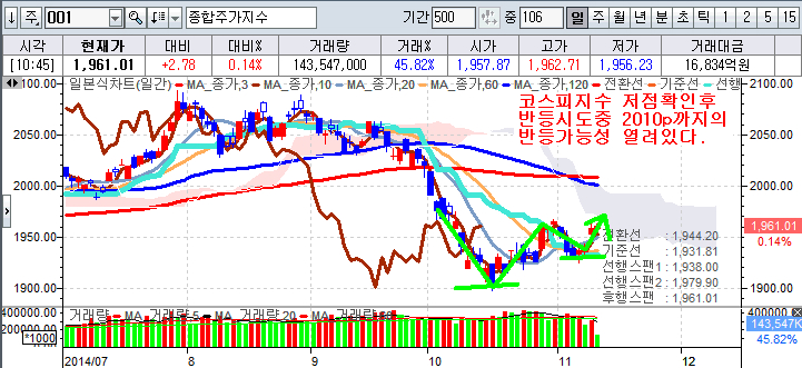 코스피지수는 1900라인을 저점으로 반등에 성공을 한후 1930선에서 저점을 확인하고 반등세를 이어가고 있어 1964P 돌파시에는 2010P전후 까지의 반등가능성을 열어두고 대응이 필요하다 하겠다.