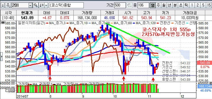 코스닥지수 박스권 하단인 530P에서 반등에 성공함에 따라 565P전후까지의 반등가능성을 열어두고 대응하는것이 바람직해 보인다.