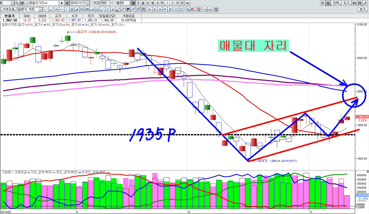 지난 주에 1935p만 지켜주면 날을 세우고 떨어지는 20일선(빨강)각을 완만하게 돌려 상승으로 전환 시킬 수 있다고 언급한 봐 있다.