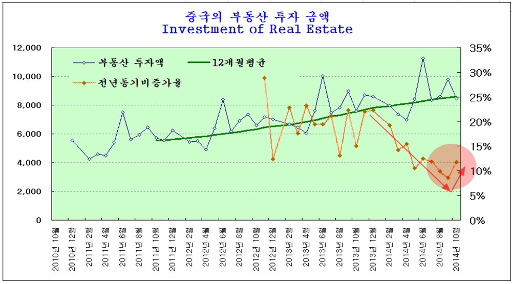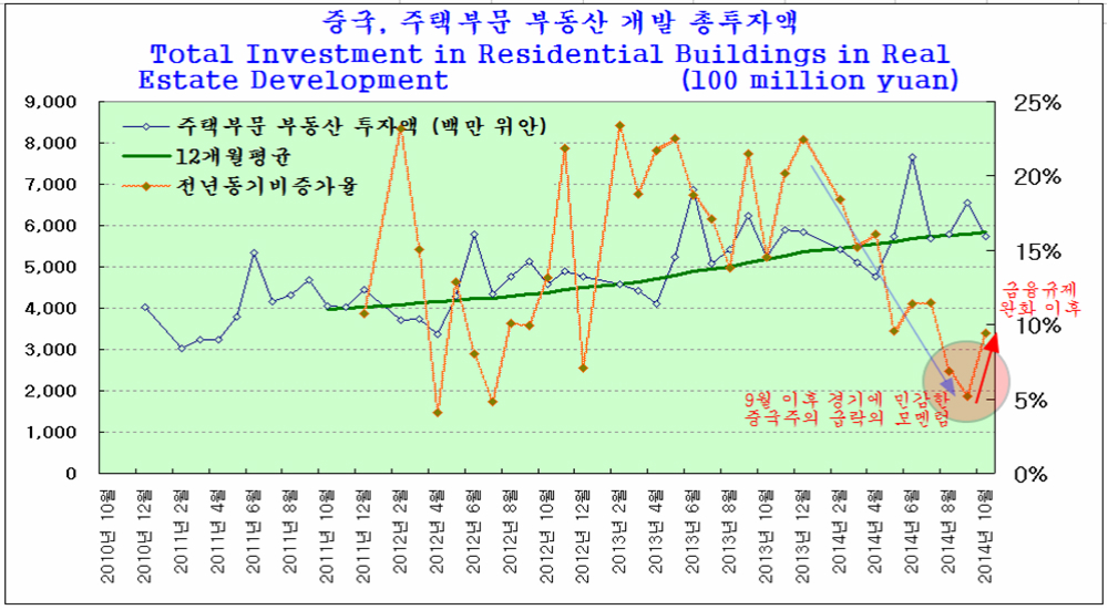 중국의 월누적 데이터를 월별 데이터로 나눠 분석한 자료이다. 중국의 부동산 투자 금액의 증가율은 2013년 12월부터 2014년 9월까지 급격한 감소 추세가 지속되면서 중국의 성장에 대한 우려를 주었으나 10월 가볍게 상승으로 추세 반전이 나타났다.