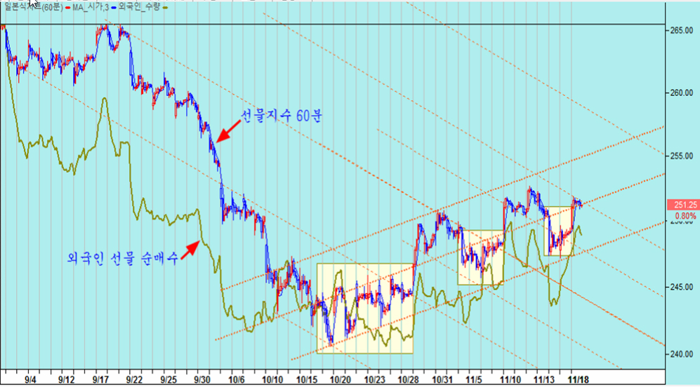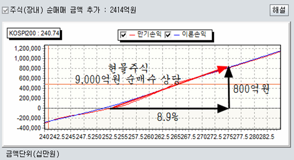 이 때문에 주가지수는 시장흐름을 제대로 반영하지 못하는 극도로 비효율적인 시장이 되어 있고, 외국인은 주가의 설계도를 그려 놓고 현물 주식 거래와 선물 거래를 통해 지수를 이 설계도 안ㅇ네서 움직이며 게임을 하고 있다고 할 수 있다.