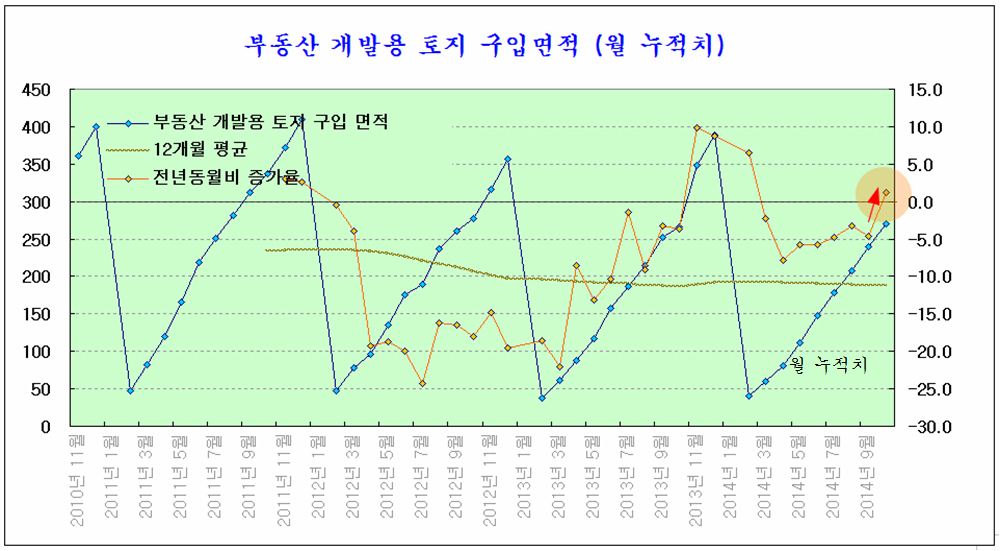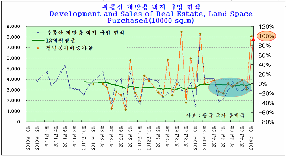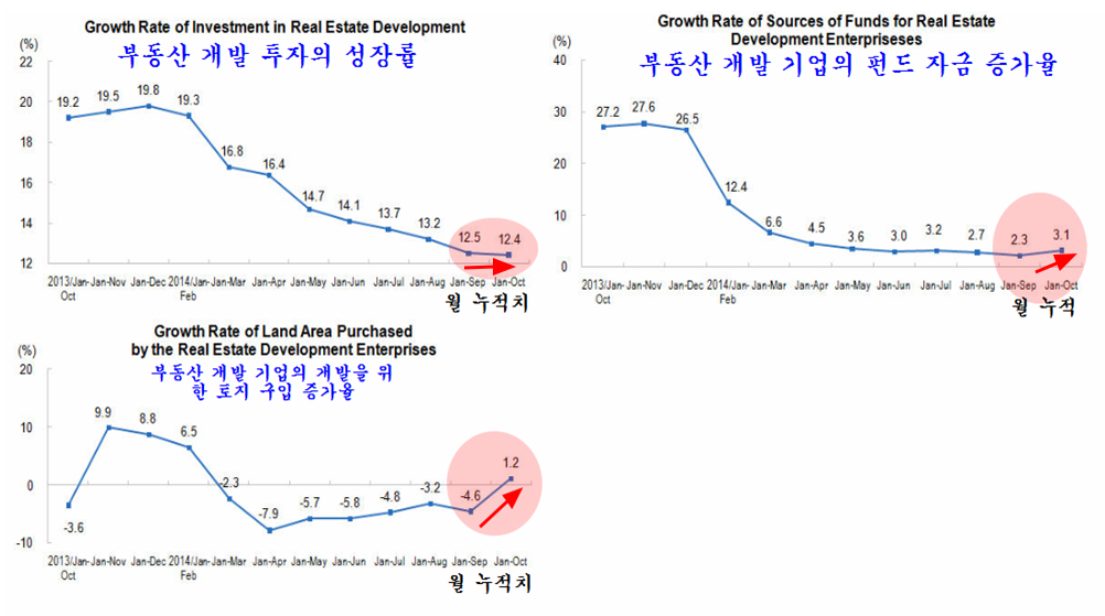 부동산 개발 회사들이 부동산 개발을 위한 택지 구입 면적은 월 누적치를 기준 올 2월부터 마이너스증가율을 보이며 9월까지 7개월간 마이너스 감소를 했으나, 10월 들어 누적치를 기준 1.2%의 플러스 증가로 전환되었다 월별 데이터로는 100%에 이르는 높은 증가율이다.