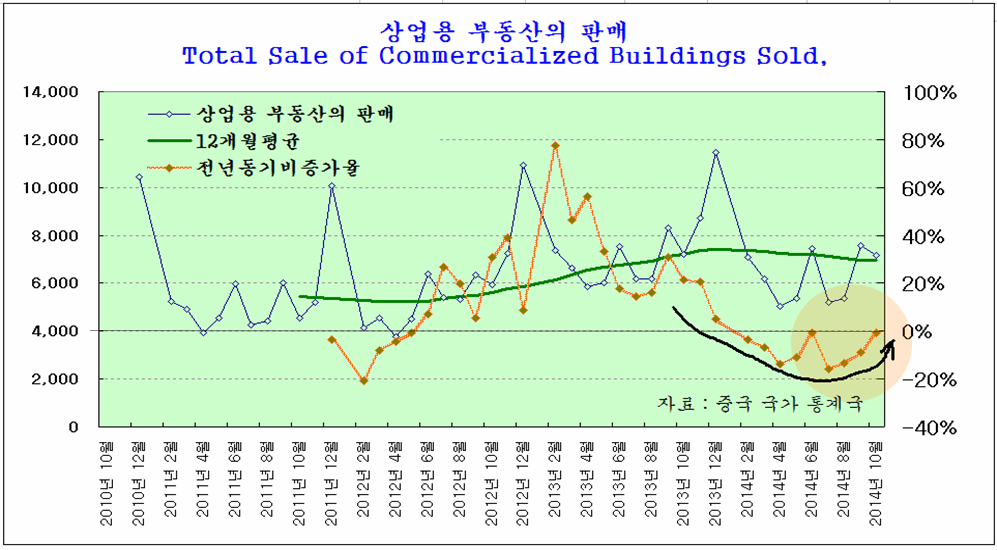 상업용 부동산의 월별 자료의 전년동월비 증가율을 보면 부동산 시장의 회복 모습이 뚜렷하다. 2012년부터 2013년 2월까지 증가하던 상업용 부동산 판매가, 중국 정부의 부동산 가격 안정을 위한 긴축과 함께 4월부터 하락을 시작하여 올 8월까지 감소를 지속하며 전년 동월비 기준 마이너스로 전환되었으나 10월 플러스 전환을 앞둔 모습이다.