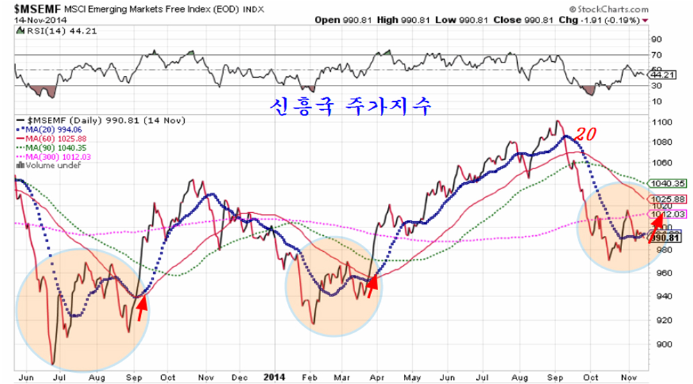 삼성전자가 20일 평균 위에서 지지 후 상승할 위치가 되자, 삼성전자의 상승과 함께 종합주가지수도 함께 올랐다.