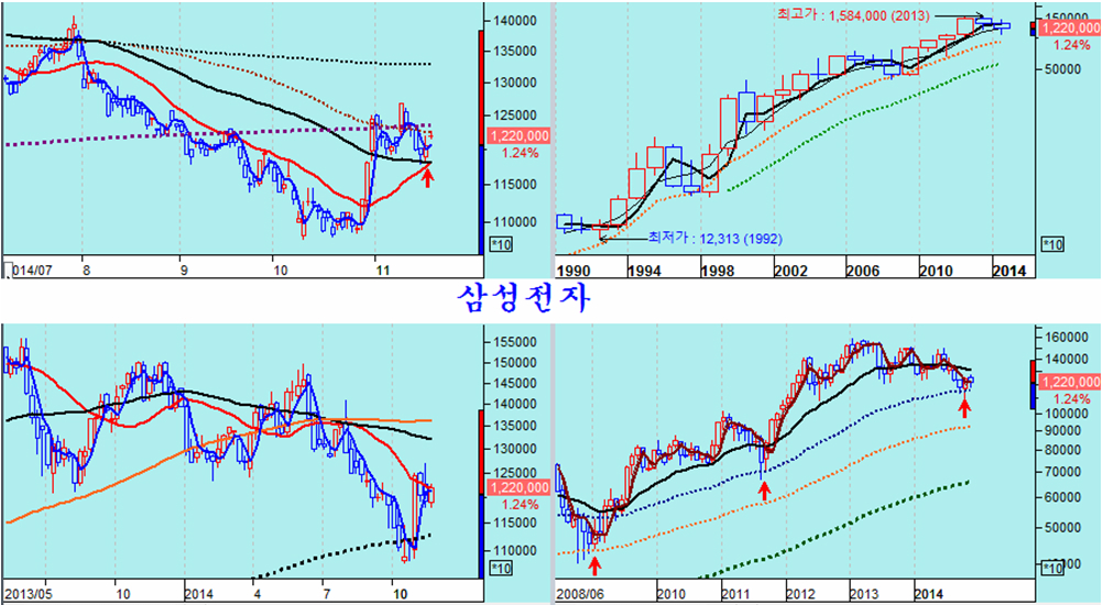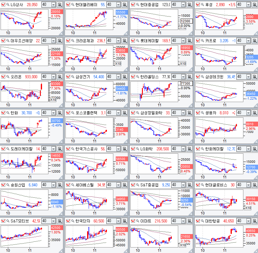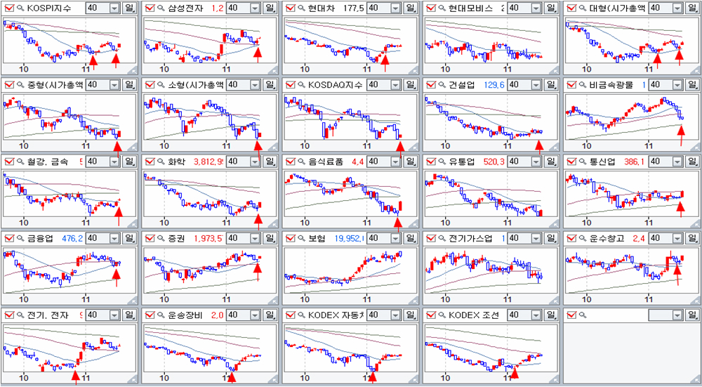 지지 부진한 지수의 움직임에도 우량 대형주들이 몇주째 완만한 상승이 이어지고 있다. 업종별로 보면, 지수를 끌고 움직이는 삼성전자가 20일 평균이 60일 평균을 돌파하는 골든 크로스를 만들며 강한 상승을 하였다. 골든크로스 이후 상승이 이어지기 쉽고, 11월 중기 추세선인 20일 평균 위로 올라선 현대차도 힘을 비축하여 다시 상승을 준비하고 있다.